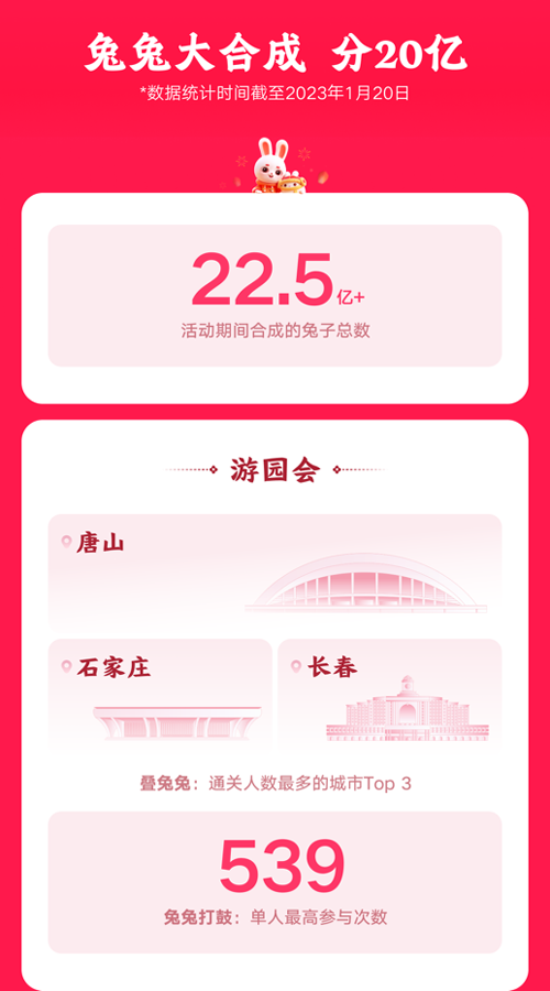 1月10日~20日,由飞鹤奶粉冠名的快手春节红包提前开抢,“兔兔大合成”“供财神”“推金币”“集福卡”“拍新年”等有趣好玩的红包游戏全面来袭。数据显示,截至1月20日,“兔兔大合成”游戏合成的兔子总数超过22.5亿只,“叠兔兔”通关人数最多的城市前三名是唐山、石家庄和长春;“跳一跳”活动累计跳跃次数高达188亿次;独乐乐当然不够,还要拉上亲朋好友一起玩,“供财神”活动累计组队PK次数超过4.6亿次。