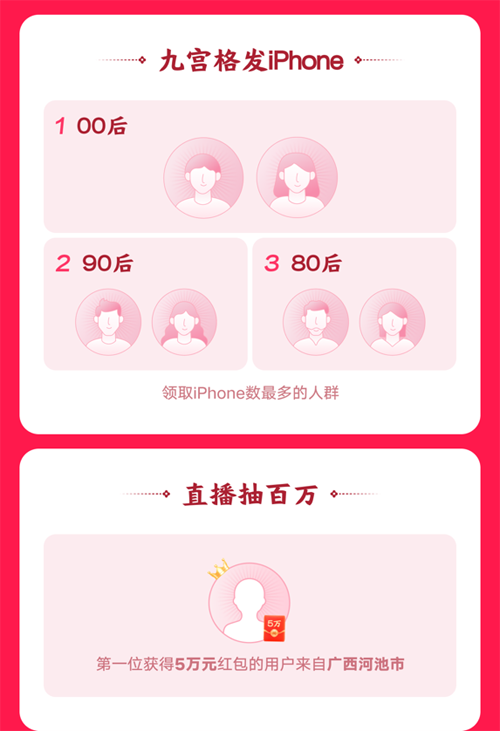 在“九宫格发iPhone”活动中,领取iPhone数量最多的是00后;“直播抽百万”活动中,第一个获得5万元红包的用户来自广西河池市;而“助力冲榜”排名第一的用户则拉到了244位好友!