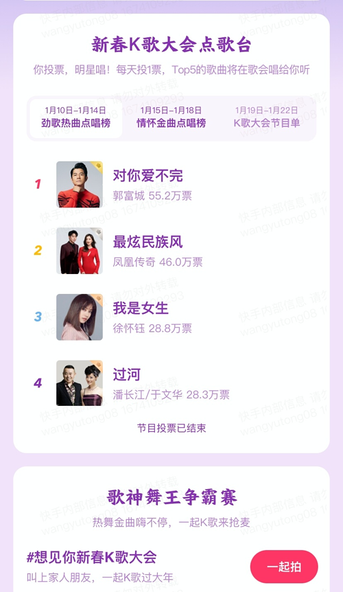 随着嘉宾阵容的公布,由用户自定义的“快手想见你新春K歌大会”完整歌单也新鲜出炉,引发网友关注。其中,在劲歌热曲点唱榜中,《对你爱不完》《最炫民族风》《我是女生》《过河》《我是一只小小鸟》成功登榜TOP5,再掀一波青春回忆杀;《隐形的翅膀》《李白》《想见你想见你想见你》《好运来》《爱人错过》则在情怀金曲点唱榜中成为用户最想听的歌曲。此外,《情歌王》《最爱》《千千阙歌》《相亲相爱一家人》等怀旧金曲也将由明星与用户一起唱响,重温经典、嗨唱新春。