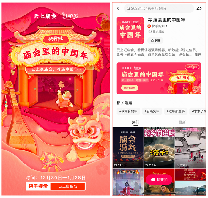 此外,快手还推出“庙会里的中国年”活动,通过庙会内容街区,以及#过年那些事、#召唤兔年、#我家乡的年、#庙会里的中国年等话题挑战赛,实现近150亿的作品播放,助力谷粒多在春节场景下持续提升品牌破圈影响力。