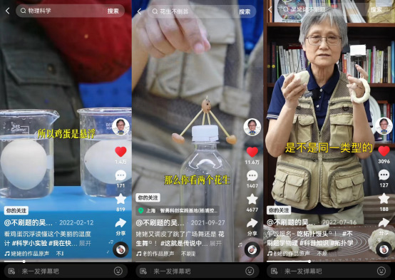 2018年,吴於人还对接上时代的趋势,化身吴姥姥,进入到短视频平台,拿出做教研的劲头。探索如何把深奥的物理知识“翻译”成通俗语言:她用铁锅讲球面射电望远镜“中国天眼”FAST,用扫把讲太空宇宙射线,用羽毛球拍讲正负电子对撞机,用面团讲拓扑学,用橡皮筋讲一维驻波。在吴於人的手里,所有的生活物品似乎都可以成为趁手的“物理教具”。
