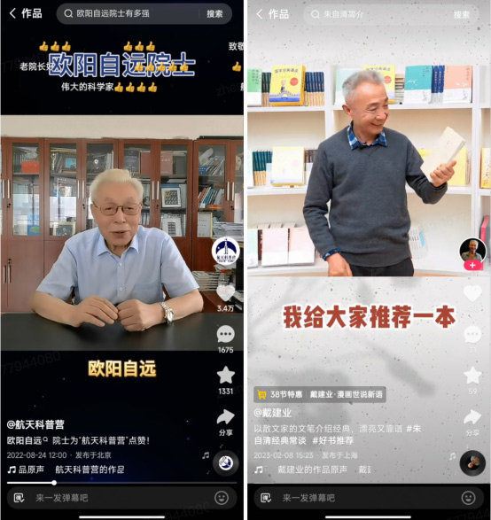 像吴於人一样,近几年来,在快手等新流量平台尝试创作的专家、教授还有很多,中国科学院院士欧阳自远,每次在快手做探月知识直播都有上百万人观看,华中师范大学文学院古代文学教授戴建业更是被粉丝们尊称为“国民教授”。