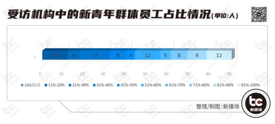 报告显示,新青年群体成为短视频直播机构员工核心构成部分,过半数机构聘用新青年群体超50%。