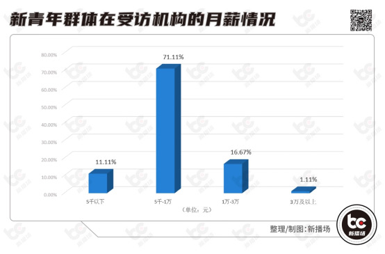 业内人士分析认为,短视频直播机构为从业者提供了丰富资源和平等发展机会。这十分契合新青年群体对工作的需求。报告指出,有54.44%的新青年群体因“发展前景好”选择短视频直播行业,排名第二的原因则是“薪资待遇好”,占比达35.56%。71%以上的新青年群体月薪介于5000元至10000元区间,较同期毕业生平均月薪水平更具备优势。