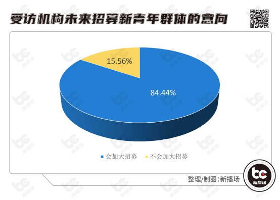 调研中,行业机构也对高校毕业生群体持欢迎、接纳态度,84.44%的机构表示会在未来继续加大对新青年群体的招募。