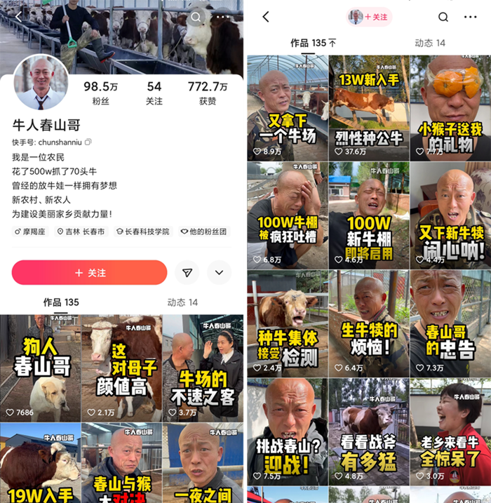 小试牛刀之后,李延庆看到了短视频平台的影响力,决定认真打磨账号。他研究“牛人春山哥”的人物属性、视频形式,还将选种繁育、均衡营养、牛棚管理等技术细节融入养牛日常,制作了大量有趣、有用、有传播力的短视频。随着运营方案、作品质量不断迭代优化,账号受到大量养牛人的喜爱,很快在快手涨粉近百万,单支短视频最高播放量突破1620万。