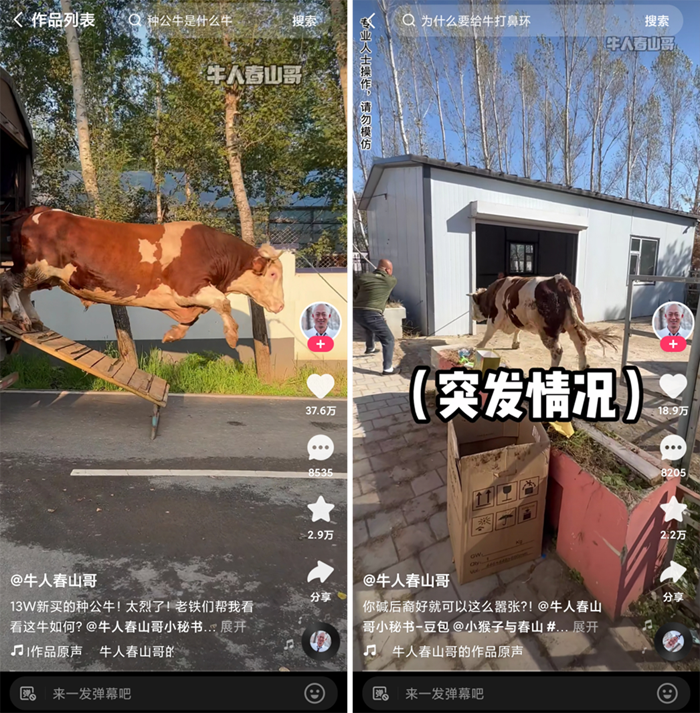 自从三年前买了第一头西门塔尔牛,李春山就对养殖产生了浓厚的兴趣。28万抓一头种公牛,500万入手70头精品牛,前后总共投入2000万买牛和做牛场基建……48岁的他,找到了人生的新使命——培育优质品种,帮助养殖户从源头实现有好牛。从事影视导演工作的堂弟李延庆了解李春山在做的事业后,决定用短视频记录李春山的养牛日常,凭借幽默的内容风格和实用的养殖技术,他们在快手上积累了98.5万粉丝。