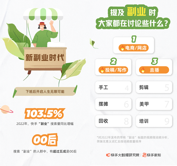 知识就是财富,人们在快手学知识,也学“致富”方式。在朝九晚五的工作之外,“新副业时代”已悄然来临。报告数据显示,快手“副业”的搜索量在2022一年增幅达103.5%;搜索的人群中超过五成是00后;创作者发布的副业相关视频中,提及电商/网店、投稿/写作与直播的视频数量最多。