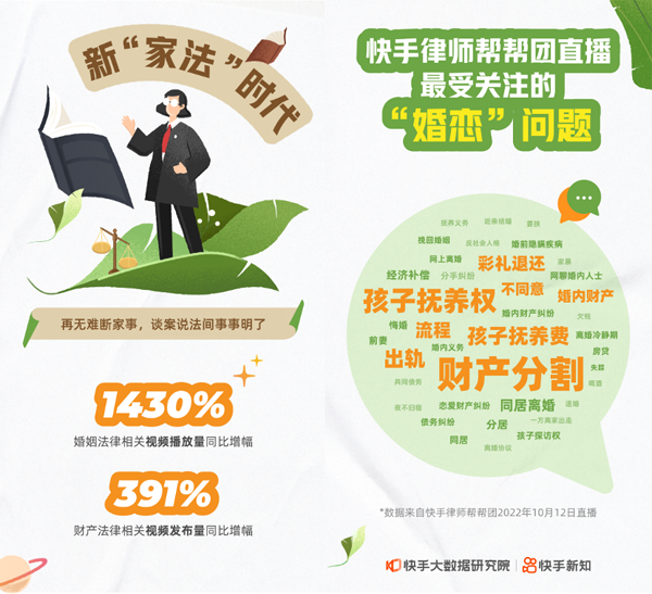 传播泛知识本身也成为一种“副业”,人们有更多渠道和机会发挥自己的专长。比如在法律界,越来越多律师通过短视频和直播普法:来自北京惠诚律师事务所的杨朝阳,在快手普法已近7年,拥有1000多万粉丝,每年都会通过快手为超过3000人提供免费的法律咨询。而来自黑龙江的执业律师@崔律师,则以理性与感性兼备的风格,每天坚持清晨7点半直播,在连线中为粉丝提供实际的婚姻建议和法律建议。报告显示,2022年11月,快手婚姻法律相关视频播放量同比增长1430%,财产法律相关视频播放量同比增长391%。可见,在新“家法”时代,用户最想学的还是与自身息息相关的“家事家法”。