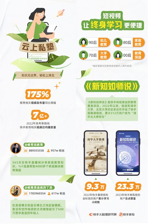 而除了婚姻,教育也同样是老百姓最关心的“家事”,无论是幼儿教育还是家庭教育,不同年龄段的教育需求都可以在快手得到满足,报告显示,快手持续打造“云上私塾”,2022年11月,教育相关视频发布量同比增长175%。除此以外,快手也竭力为用户们提供更优质的教育资源,教育普惠项目《新知如师说》2022年先后和清华大学、北京大学历史系等头部院校合作开设假期课程班,让累计312万用户成为"清华北大旁听生”。