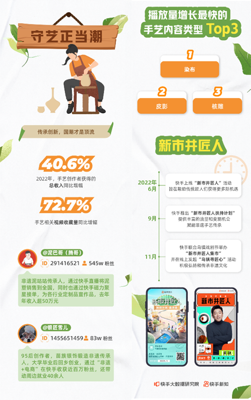 为了进一步赋能非遗手艺的传承,快手在2022年6月上线“新市井匠人”活动,9月推出“新市井匠人扶持计划”,为手艺达人们提供丰富的流量与变现机会。11月,快手还联合乌镇戏剧节举办“新市井匠人集市”,在线上发起“乌镇寻匠心”主题活动,积极弘扬和传承非遗文化。