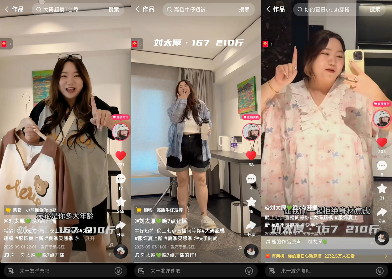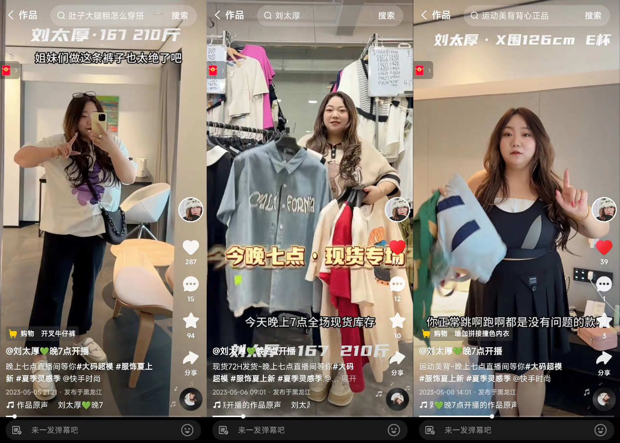 在活动话题下,众多商家达人积极产出,活动相关视频总播放量超过5.89亿,带动总涨粉3833万。在活动高曝光下,众多大码女装赛道优质达人脱颖而出。其中,来自哈尔滨从教师转行女装主播、月GMV 800万的快手大码主播“刘太厚”是本次活动的代表商家。
