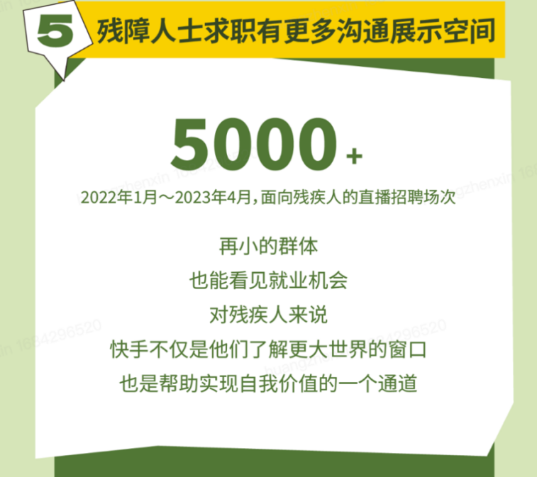 快手不断探索互联网时代的助残模式,通过线上“快聘”直播间,为残障人群提供了更加丰富、直接、透明,适合自身情况的岗位,让企业和求职者之间提高了匹配精准度,实现了残障人士更加高质量的就业。据了解,在快手发布的《2023快手就业价值报告》中显示:2022年1月到2023年4月,快手面向残障人士的直播招聘场次超过5000场。