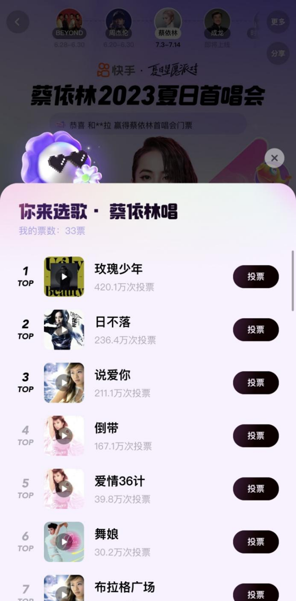 除了直播批改作业,深谙宠粉之道的蔡依林,还会在直播中翻牌用户评论,帮粉丝完成告白心愿。值得一提的是,在今日发布的短片中,蔡依林还提到将在快手独家线上演唱会中,带来诚意满满的14首歌曲,其中11首由蔡依林亲选,剩下3首将由快手用户通过投票决定。截至目前,《玫瑰少年》《日不落》《说爱你》暂居投票榜前三。