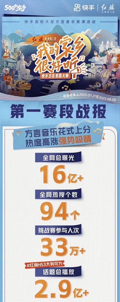 作为快手首档大型方言音乐竞演活动,此次方言麦霸大赛于7月21日启动。截至8月3日,第一赛段“家乡上分挑战赛”圆满落幕,活动全网总曝光突破16亿,登上全网热搜94个,挑战赛参与人次超过33万。同时,本次大赛独家冠名商红旗HS3相关话题#红旗HS3大有可为 总播放量突破2.9亿。