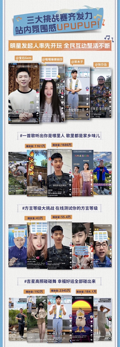 锤娜丽莎则是带来江苏盐城话版的歌曲《州州》,并发起#方言等级大挑战,用户通过魔表玩法,用《州州》旋律唱出魔表随机生成的各地方言词,在线测试自己的方言等级。而在宝石Gem和宋木子发起的#吉星高照碰碰舞挑战中,用户与宋木子同框合拍魔性“碰碰舞”,搭配宝石Gem演绎的东北方言版歌曲《人生碰碰碰》,碰出好运与幸福。仅宋木子发布的活动视频播放量就超2300万。