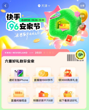 据介绍,活动期间,用户在直播间可领取最高3666元的购房礼金,还可抽取1666快币和888元现金。此外,用户邀请好友参与活动,还有机会获得iPhone等奖品,完成线上选房、线下看房也有惊喜好礼赠送。