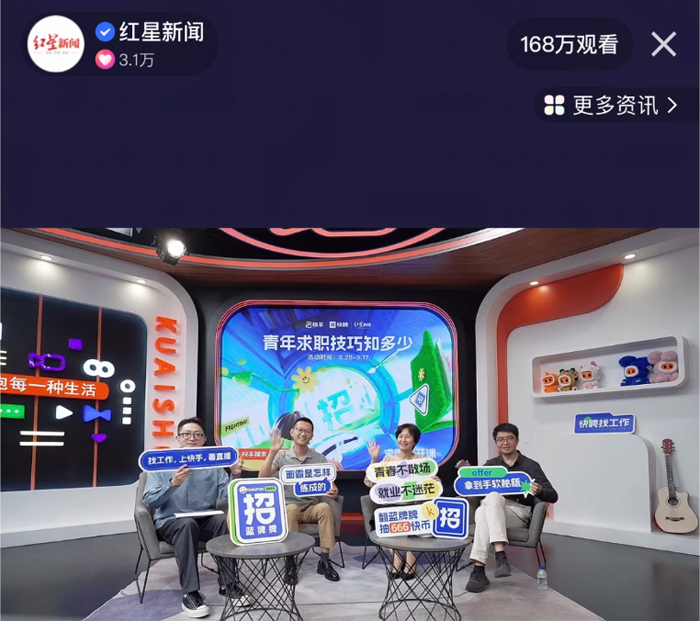 据了解,快聘青年求职专场系列活动将持续至9月17日,汇聚各行业内的招聘专家,集结新能源、智能制造等行业名企入驻直播带岗,打造高效求职通道。此前,央视网快手号打造了“职业新赛道 职为你来”直播,邀请多位业内专家、企业代表,为青年群体带来一场求职技巧公开课。