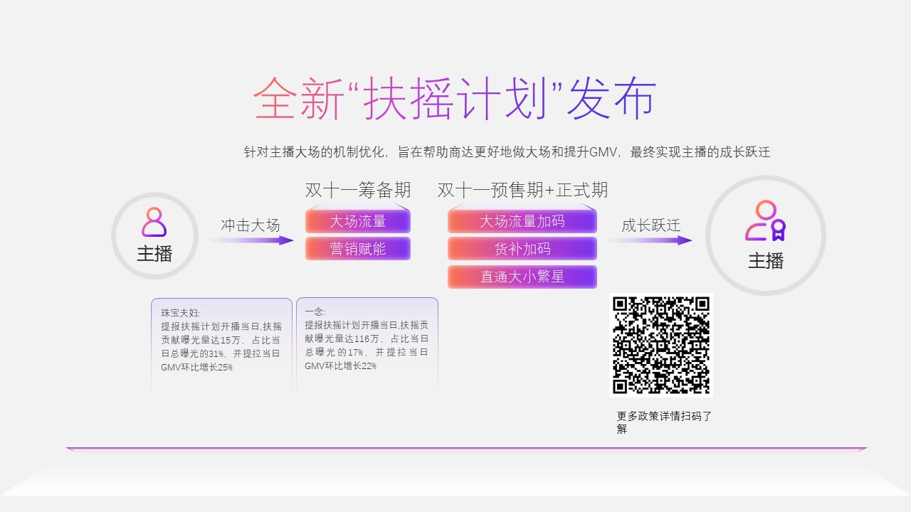 快手电商大促运营负责人谭帅表示,双11是平台下半年最为关键的营销战役,快手电商将在此次双11投入180亿的流量扶持和20亿的商品补贴,助力商家和主播生意爆发。此外,快手电商同时发布“扶摇计划”, 针对主播大场进行机制优化,帮助商家更好的做大场和提升GMV,最终助力主播的成长跃迁;通过流量,营销,补贴等多方面机制优化,在大场的不同阶段(前、中、后),结合主播货盘、商业化投入等信号给予主播确定性的大场流量分配机制。
