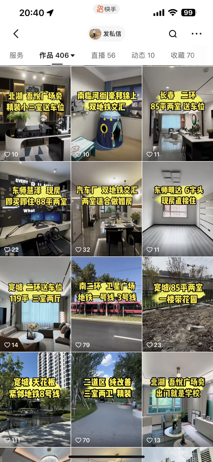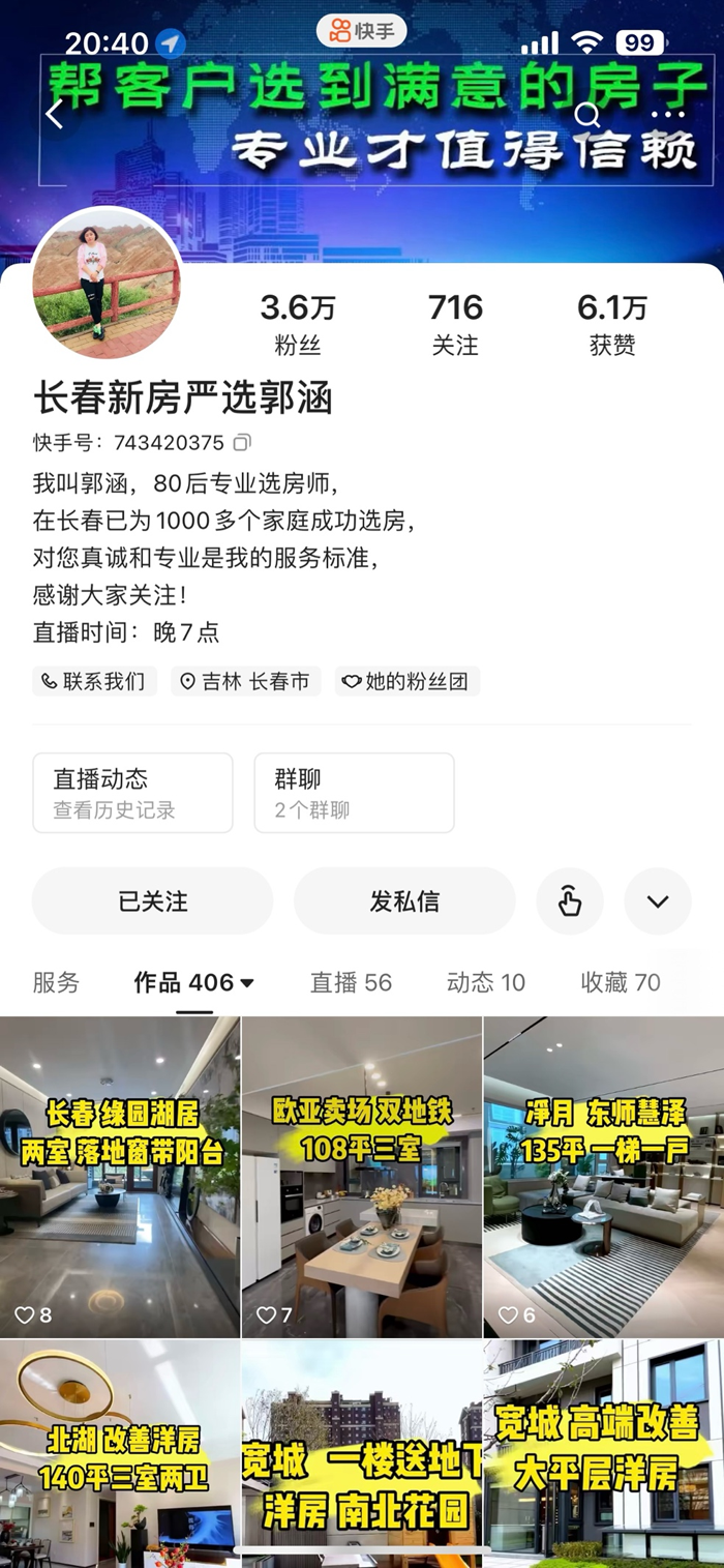 但像这种改善性需求的购房客户只是少数,在郭涵看来,快手用户年龄很符合市场的购房群体,长春外五县,以及一些周边城市的人们基本都在玩快手,“来找我购房的也是外地群体偏多,基本都是希望为在长春学习、工作的孩子购房,想让他们尽快安定下来的家长”。