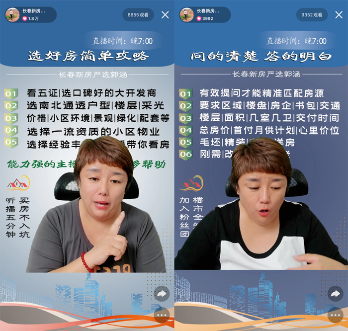 在她看来,“解读”是房产主播的责任之一,“比如长春最近出台了11条楼市政策,很多粉丝看了就觉得很多字好像没看懂,我就会用更浅显易懂的语言让大家一听就懂,避免毕业生、外地常住人口这些人群错过这些利好”。