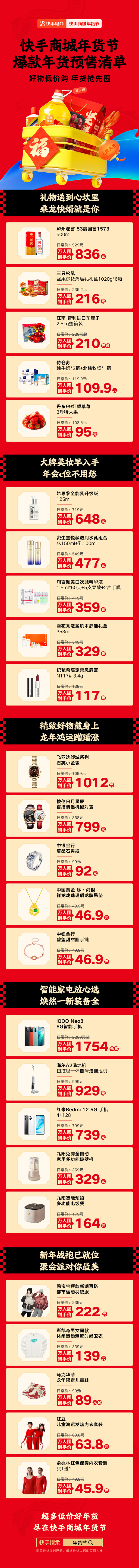 此外,快手电商重磅推出“万人团”玩法,由官方招募、筛选出兼备时令属性、高货值属性、低价属性的优质商品,通过内容场与货架场双域联动,平台提供高流量、高补贴,促成优质商品的快速成交。“低价特卖”频道则主要面向民生品牌及白牌商家,报名成功的优质商品在年货节期间有机会获得平台补贴,以及商城“低价特卖”频道、搜索、推荐等场景分发,助推商品扩大销量。