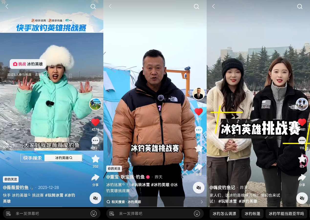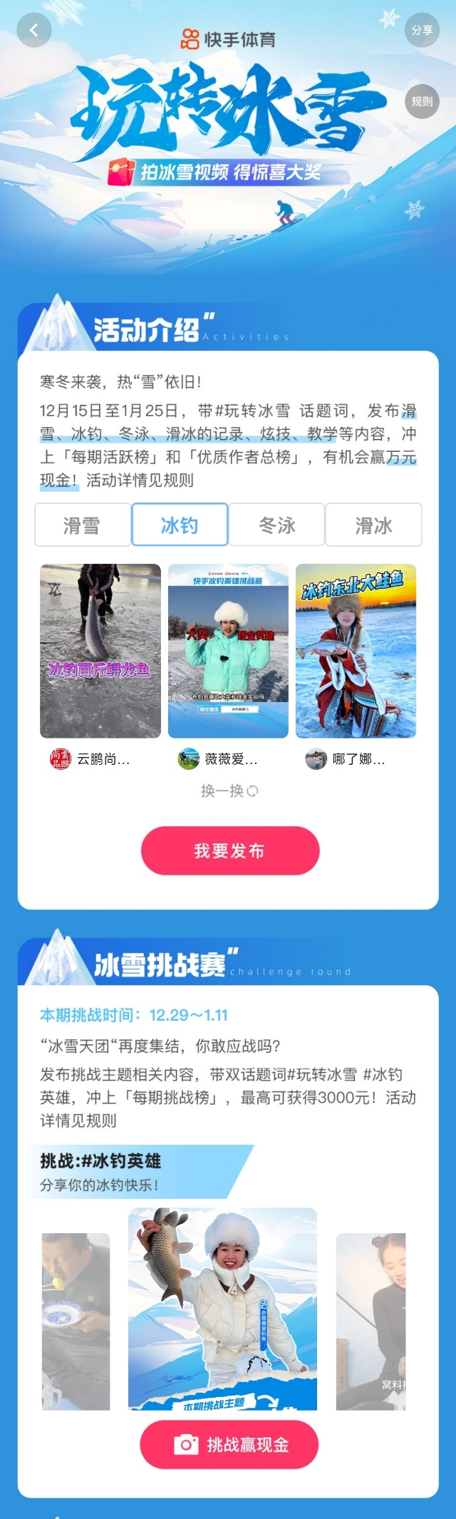 在线下赛事热火朝天的同时,“快手冰钓英雄挑战赛”的线上“玩转冰雪”挑战赛也在同步进行中。2023年12月15日至2024年1月25日,快手面向全体创作者,开放3期不同主题的短视频创作活动,用户带#玩转冰雪 话题词和主题词,发布滑雪、冰钓、冬泳、滑冰的运动记录、炫技、教学等内容,即可参与活动,冲上「每期活跃榜」和「优质作者总榜」,赢取得现金、流量奖励。