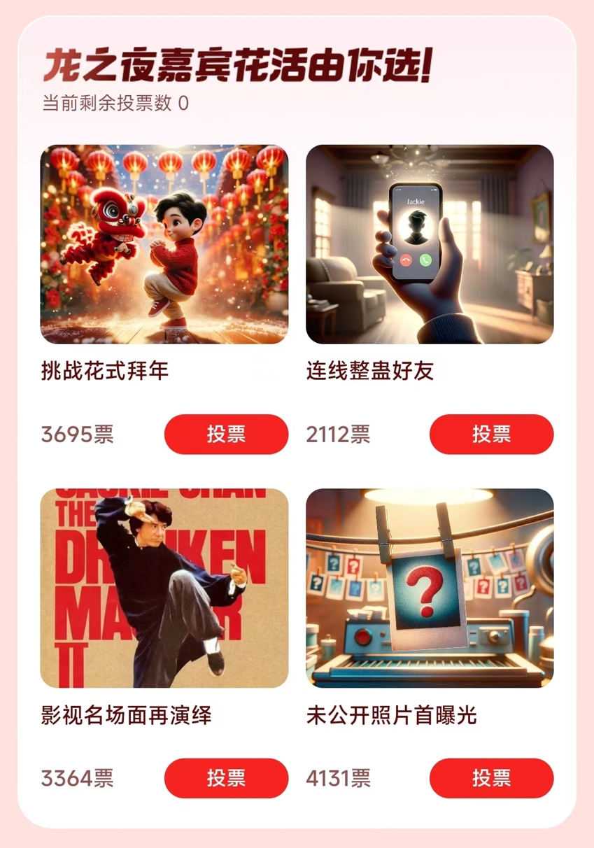在众人为最终的“龙之夜菜单”努力时,快手将用全民皆可参与的线上投票互动玩法,让用户在数字世界找回仪式感,挑战花式拜年、连线整蛊好友、影视名场面再演绎、未公开照片首曝光等嘉宾花活任大家挑选。活动期间,上快手搜索「龙之夜」预约直播、完成互动,更有机会赢取金条大奖,在欢聚的时刻上演龙年遇成龙、龙年行龙运。