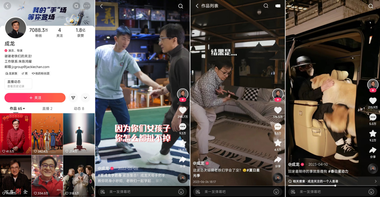 早在2021年10月,成龙就正式入驻快手,开通了其全球首个短视频社交账号。截至目前,成龙的快手账号粉丝量已突破7088万,是当前快手站内粉丝量最多的明星账号。老铁们亲切称他为“龙叔”,通过短视频看他发帖教女性防身、玩转花式功夫运镜、练习蹲马步打麻将、分享自己的养狗趣事……始终保持小人物精神的成龙,以有血有肉、有喜有悲的真实状态示人,为老铁们带来无数情感共鸣时刻。
