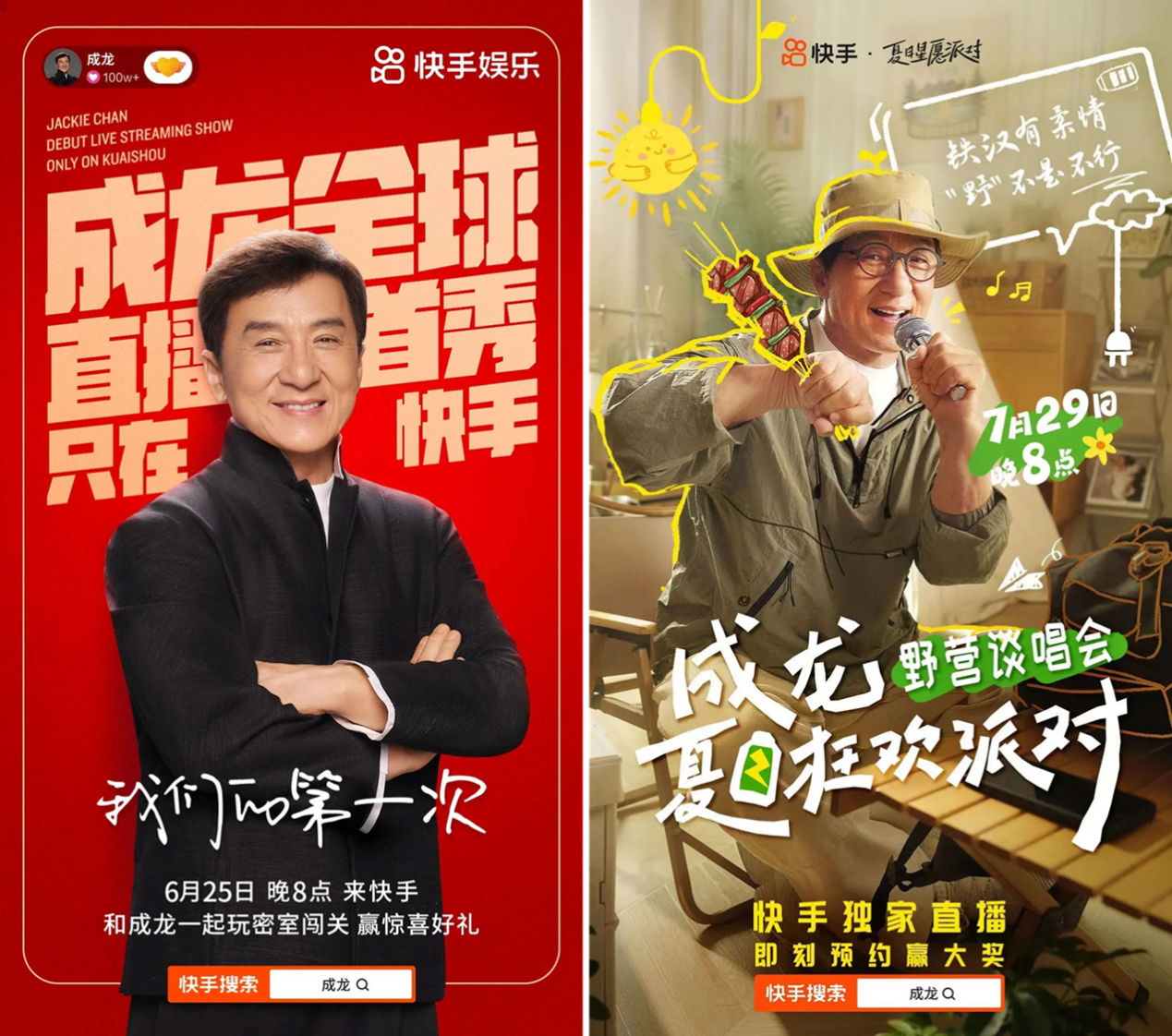 2022年6月,成龙以「我们的第一次」为主题在快手发起全球直播首秀。直播围绕成龙出道60年展开,回顾了他既有鲜花掌声、也有伤痛疾病的闯荡生涯。期间,不仅有黄子韬、谢霆锋等明星助阵成龙开启历险之旅,还有三位快手达人作为密室闯关“守关人”和成龙切磋比试。数据显示,该直播累计超2.2亿人次观看,互动量高达3.2亿。