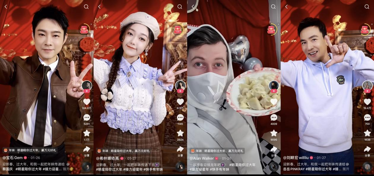 参与拍摄「接力迎星年」短视频的明星中,不仅有知名演员李晨、柳岩、龚俊、钟楚曦、许凯、庄达菲等,也有人气歌手宝石老舅、希林娜依高、Alan Walker,相声演员张九龄、烧饼等,汇集了多个领域的人气明星。在年龄跨度上也是尽可能满足不同用户的需求,不仅有新生代偶像TF家族三四代成员,也有艺人前辈蔡国庆、龚琳娜、腾格尔、孙悦、胡海泉等。