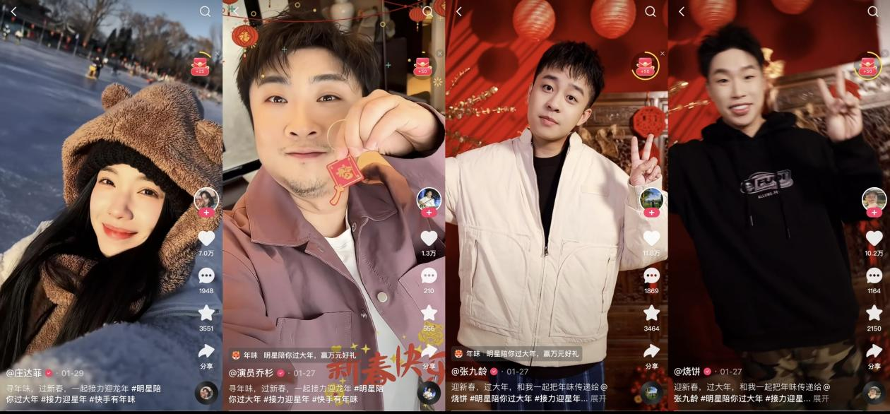 1月26日,快手先后上线了「接力迎星年」、「星春瓜瓜乐」、「星春独家直播专场」等丰富内容与有趣玩法。来自不同领域的明星在快手上通过拍视频的方式梦幻联动,接力迎新年,在直播间更是花式整活只为满足粉丝心愿。一边是为老铁谋福利、送欢乐的明星,一边是为偶像热情打call的粉丝,一场群星与快手用户双向奔赴的春节大联欢在快手热闹来袭。