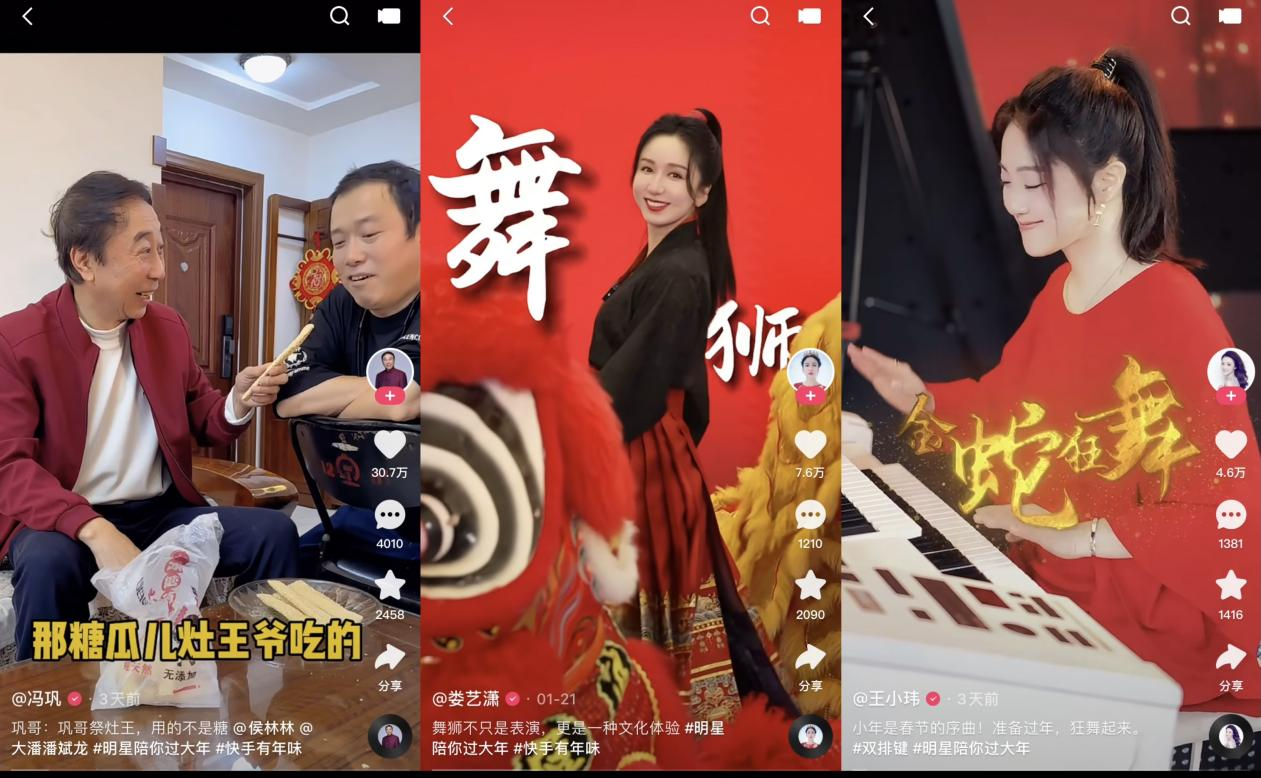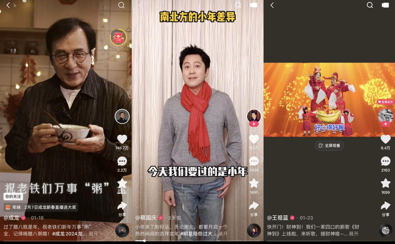 除了快手为明星量身打造的迎新年专属视频模板,早已练就了各种整活技能的明星们,也为粉丝陆续送上了专属祝福视频。腊八节当天,成龙用一支十分酷炫的短视频为老铁们送上了一碗“万事粥全”的腊八粥;蔡国庆分饰两角,为老铁讲解起南北方过小年的差异;一向爱搞怪的王祖蓝,携家人拍摄的《财神到》魔性又上头;还有冯巩与大潘合拍的节日段子、娄艺潇的舞狮体验、王小玮带来的《金蛇狂舞》等等,都让人感受到了浓浓的春节氛围。