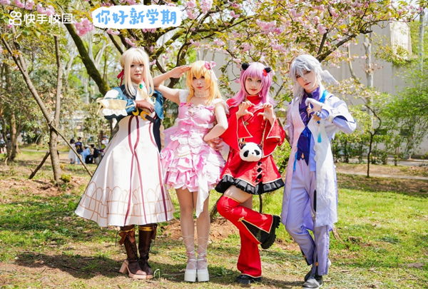 除了小杰大和三点良人活动现场给大家带来欢声笑语,摄影达人@钟小课 在为参与活动的用户拍照、拍写真,现场教学如何在浪漫樱花季节拍出唯美大片,引来不少女大学生的“星星眼”;而二次元达人@一头野菜豚 与武大相关社团在樱花树下的展示,也将现场的氛围感拉满。