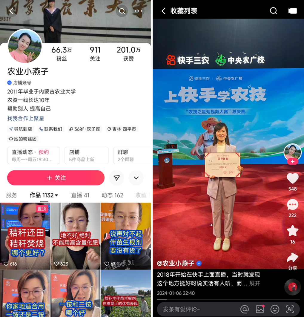 自2013年起,邓燕在吉林四平经营的农资实体店,服务了周边乡镇数以千计的农户。在这个过程中,她愈发意识到普通农民缺乏专业的农技科普,对于农资产品的优劣和用法更是知之甚少。与此同时,邓燕发现快手在三农群体中渗透率极高,果断在2018年开通快手账号,入驻这个生机勃勃的新农人社区。
