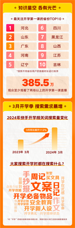 在今年春季开学季,快手用户对开学相关内容的关注度大幅提升,更多用户开始在快手上搜索相关教育信息。相较于2023年,2024年3月快手开学相关词搜索量提升了112%。