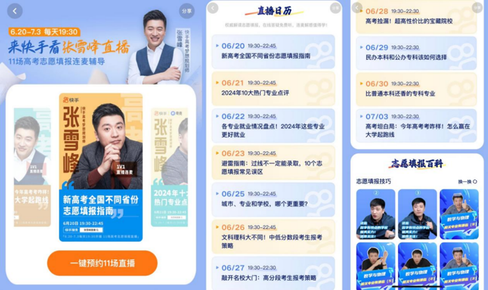 接下来,快手将借助短视频直播的形式全方位帮助广大考生和家长了解高考志愿填报相关事项。填高考志愿看快手,现在起上快手一键预约11场直播,6月20日至7月3日每晚7点半,张雪峰在快手直播间与你不见不散!