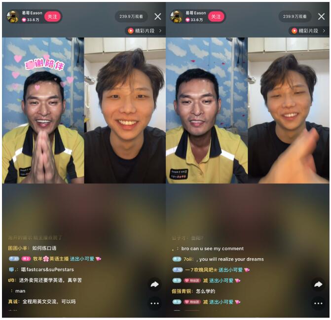 “讲英语这么好,怎么不去当老师”,面对老铁的疑问,@易哥eason 在直播间坦言,之前确实面试过英语培训机构,对方很认可自己的口语,但由于学历问题以及没有教育经验,最终还是被刷下来了。而一次送餐时,一次和外国人的简单交流让易哥找到了另外一条路。如今在快手上,用英文侃侃而谈的@易哥eason 闪闪发光,第一场直播就吸引近400万老铁观看。
