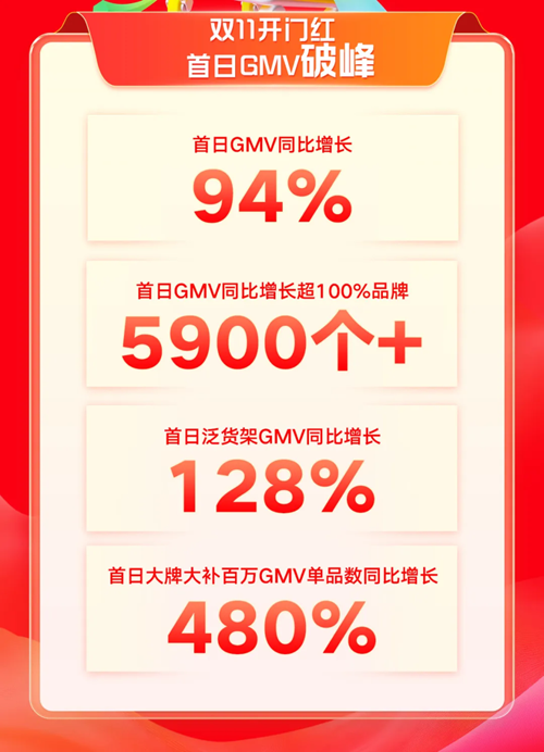 据报道,今年快手双11启动首日GMV即破历史峰值,同比去年增长了94%,泛货架GMV同比去年增长了128%,首日GMV同比增长超100%的品牌超5900个。与此同时,快手电商内容场持续爆发。19日0点-20日17点,快手平台日均直播间商品曝光次数超100亿次,单场GMV超2023年双11峰值直播间超16000个,成交破百万GMV的直播间数量达193个。