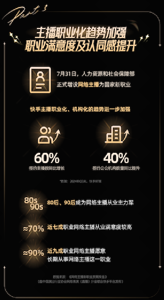 7月31日,人力资源和社会保障部正式将网络主播纳入国家新职业范畴,标志着业内对这一新兴职业的正式认可。快手平台积极响应,主播职业化、机构化的趋势进一步加强。截止2024年第三季度末,快手签约主播数同比增长60%,签约公会机构数量同比提升40%。