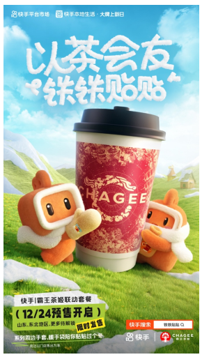 2024年12月24日至2025年1月3日,快手联动霸王茶姬推出联名活动,上新冬日限定套餐“贴贴套餐”和“暖暖套餐”。在山东、天津、河北、东北地区门店,通过快手下单联名套餐并核销,即可获得手套、暖水袋的限定周边。