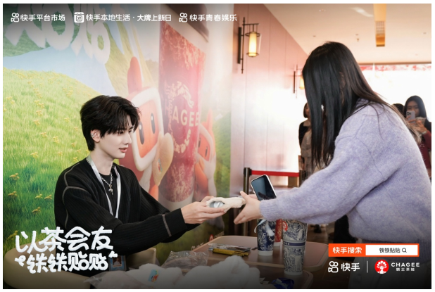为充分发挥内容营销线上线下相结合的优势,活动还于12月27日在霸王茶姬济南门店落地了一场“铁铁贴贴温暖行动”。邀请明星甘望星、快手达人赵辰宇、李歪歪,化身好茶体验官以及一日店长,与粉丝“贴贴”互动,送上冬日温暖。
