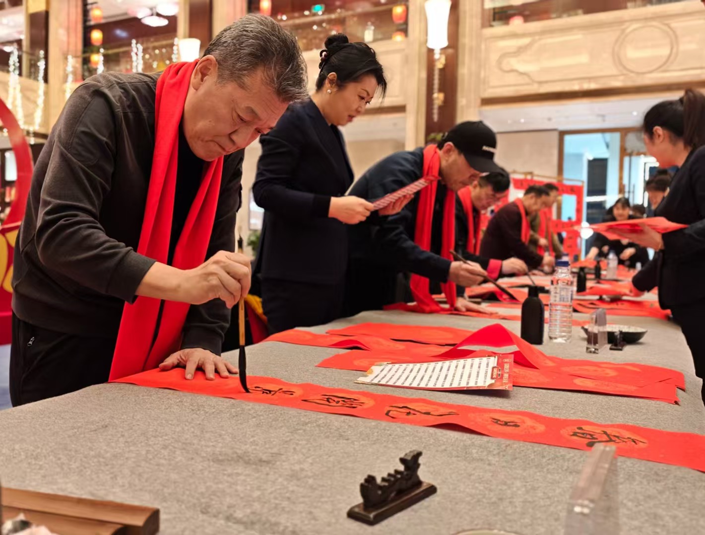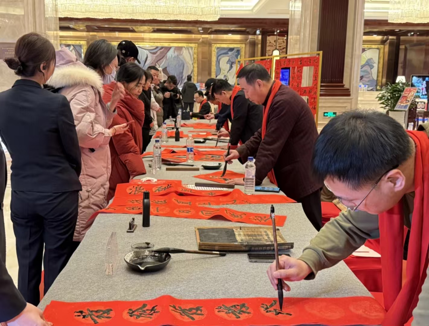 笔下生辉,墨舞翩跹。我市著名书法家吴晓光、蔡星海、蔡华立、赵彦辉、刘德培老师,在酒店定制的春联及福字上,尽展书法之美,新春祝福跃然纸上。现场宾客笑声晏晏,在领取春联和福字的同时,互相交流讨论着书法的魅力。