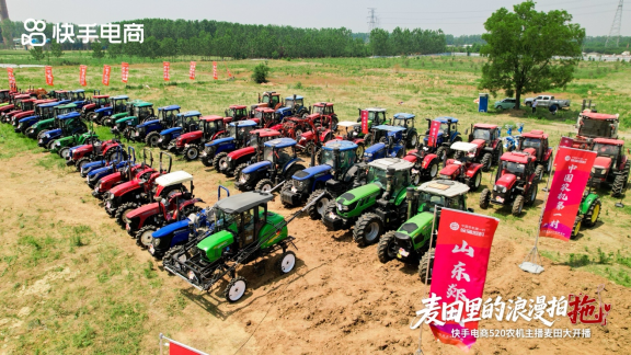 5月20日,快手电商携手农机达人@牛总说农机 和@慧凯农机·颜廷贵 及40余位农机主播分别在山东临沂市郯城县徐蒲坦村、吉林省松原市两地开启了两场520拖拉机专场直播。