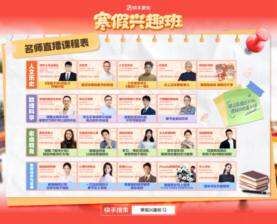 2月1日至3月3日,快手上线“寒假兴趣班”系列活动,邀约余世存、纪连海、不刷题的吴姥姥、李永乐等百位名师及优质知识创作者,开设寒假直播课程,助力广大学子假期学习进步、通识提升、兴趣寄托。