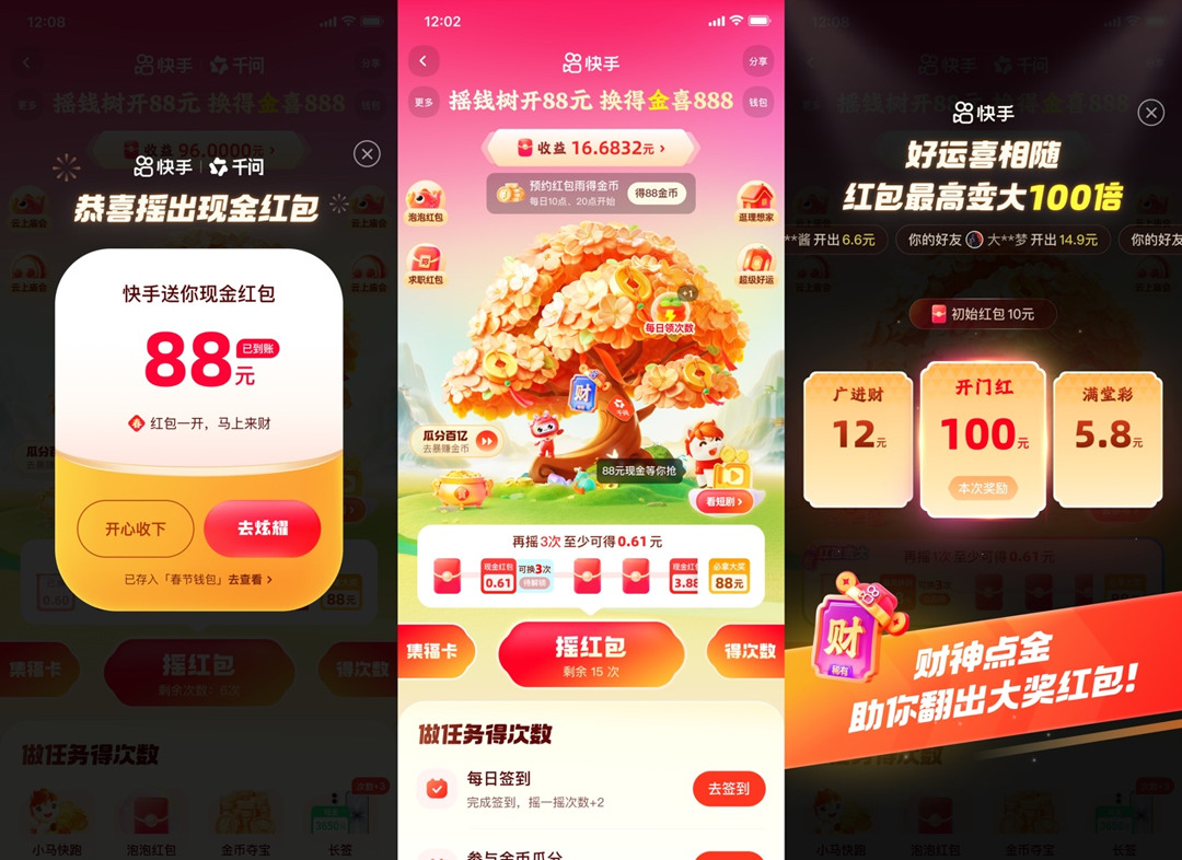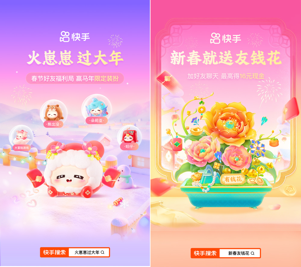 从2月4日至23日期间,快手推出丰富多样的红包玩法与互动活动,兼顾趣味性与实用性,涵盖“摇一摇领红包”“换红包”和“点金卡”“卫视春晚联动下红包雨”“集卡瓜分2亿”“好友互扫招财码”“小马PK赢金币”等,配套现金、金币、实物好礼等福利。同时,平台上线“火崽崽过大年”“新春友钱花”等社交互动活动,搭配多知名IP联名装扮,进一步丰富亲友团圆互动形式、增添节日仪式感。