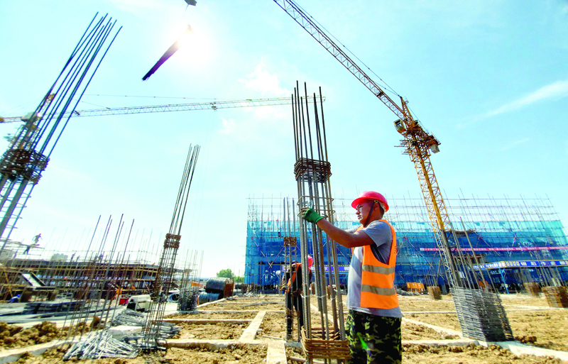 图为在昌邑区泽信依山郡项目施工建设现场,工人们在高温中施工作业。