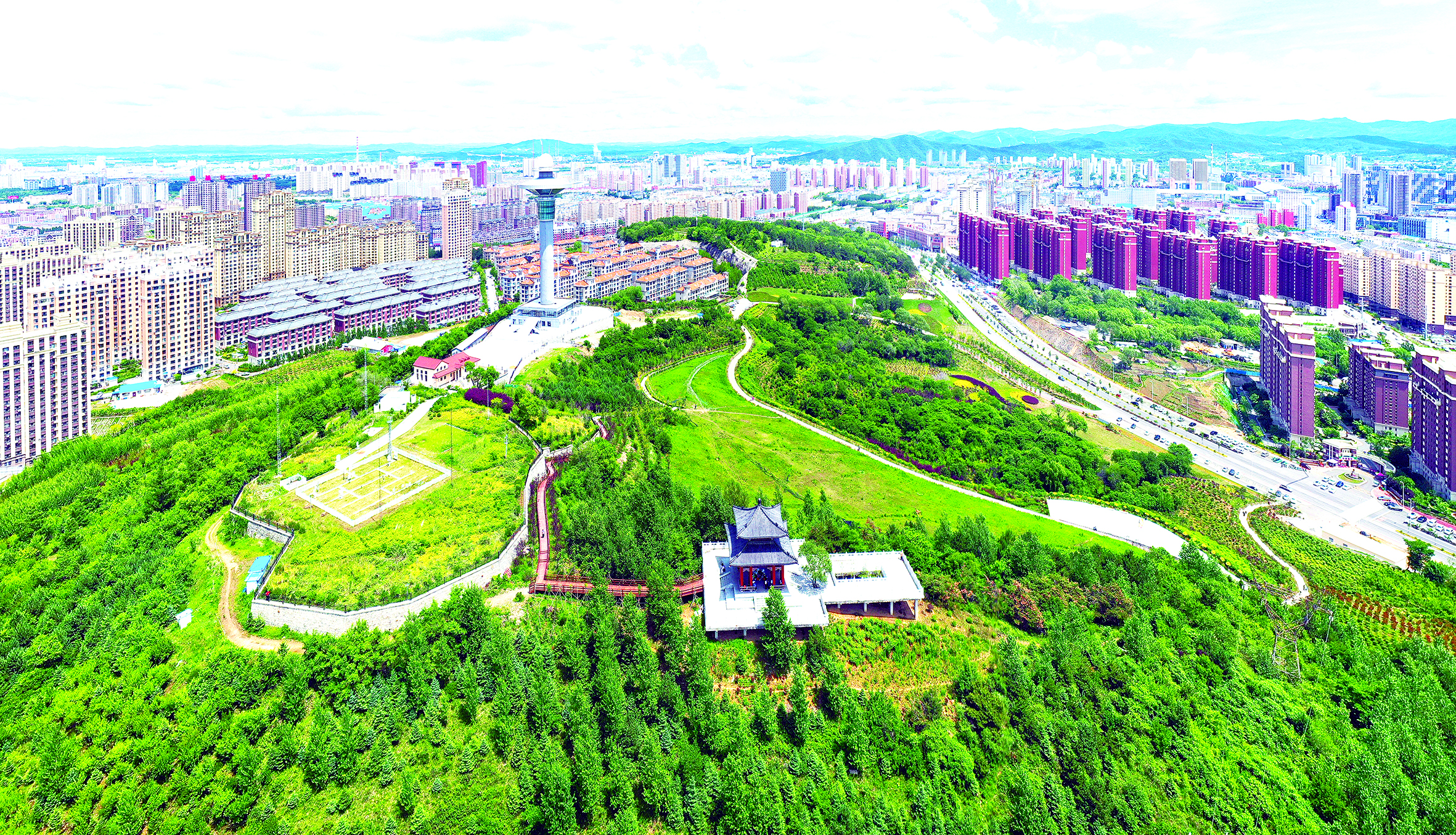 8月30日,航拍下的桃源山公园绿意盎然。近年来,我市在城市建设中坚持生态优先,践行绿色发展理念,大力提升百姓居住环境质量和城市绿色景观品质。经过改造后的桃源山,如今已成为人们休闲健身的好去处。
