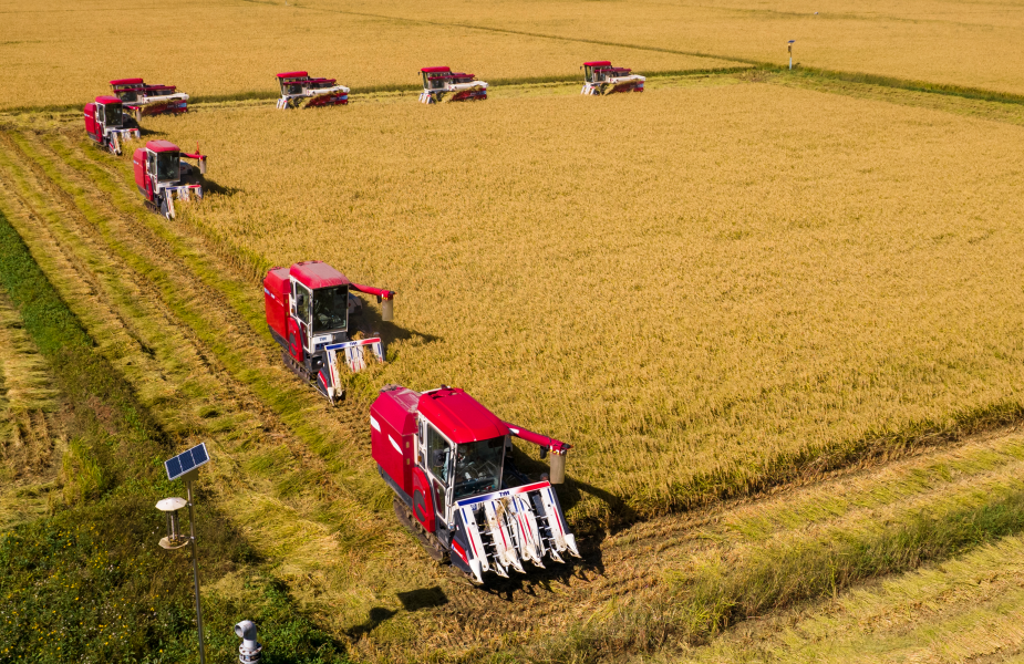 9月20日,在昌邑区孤店子镇东福米业绿色有机水稻种植基地,十几台收割机在田间往来穿梭,收割水稻。据介绍,该基地主要种植稻花香和超级稻两个品种,今年稻花香和超级稻产量预计会超过去年。