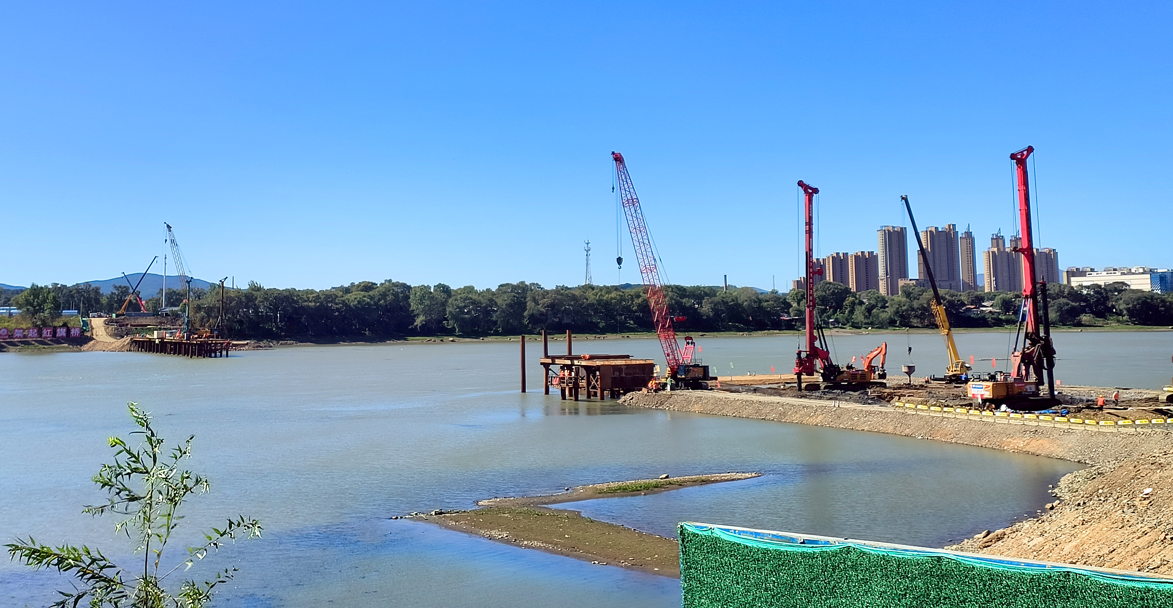 红旗大桥建设项目9月1日启动基础施工后,项目承建单位快速有序推进各项施工作业。截至9月22日,南北两侧引桥桩基础施工、主桥桩基础施工、主桥钢便桥及主桥筑岛围堰施工已经完成。